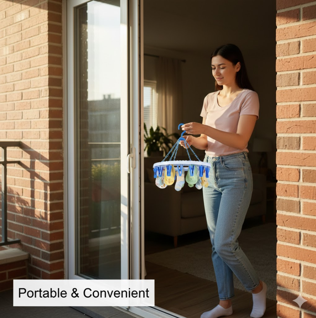 Clip hanger upgraded with Windproof hook which can effectively prevent the hanger from being blown away by strong wind. 360° rotating design makes all clips easy to access, easy to clamp and unload. Equipped with 24 clips with non-slip teeth and steel springs can hang many small items.